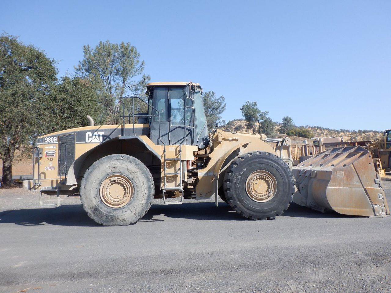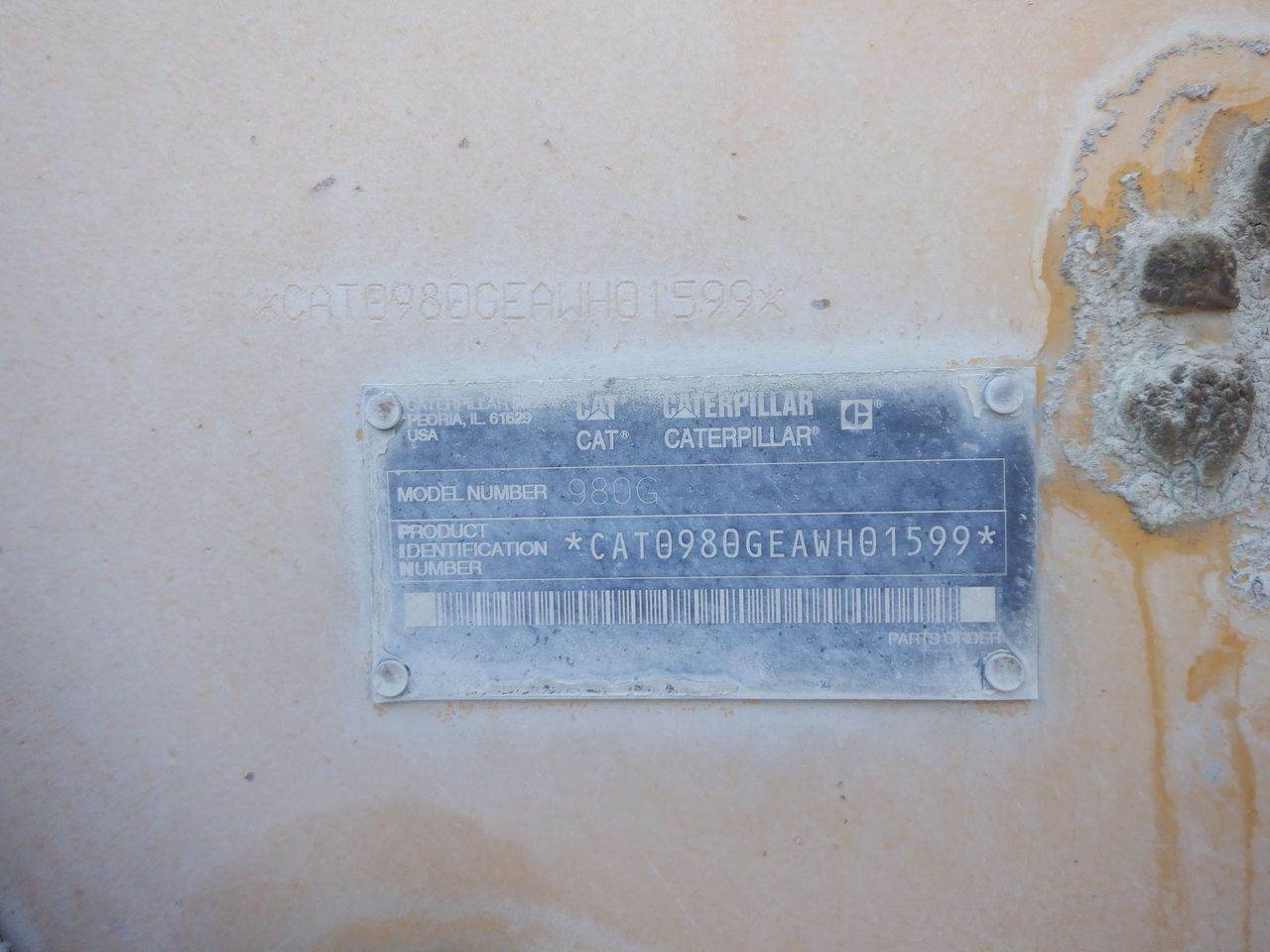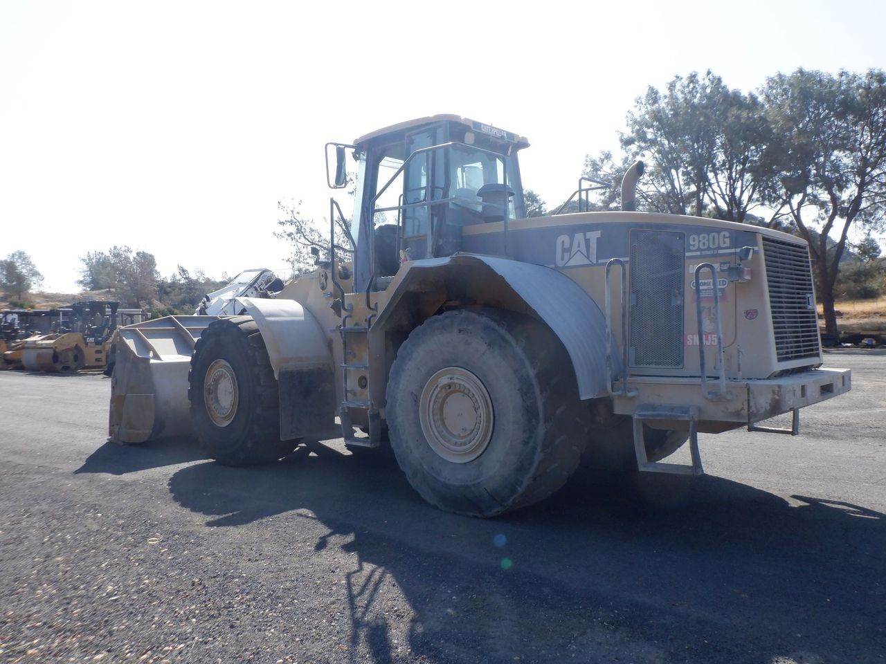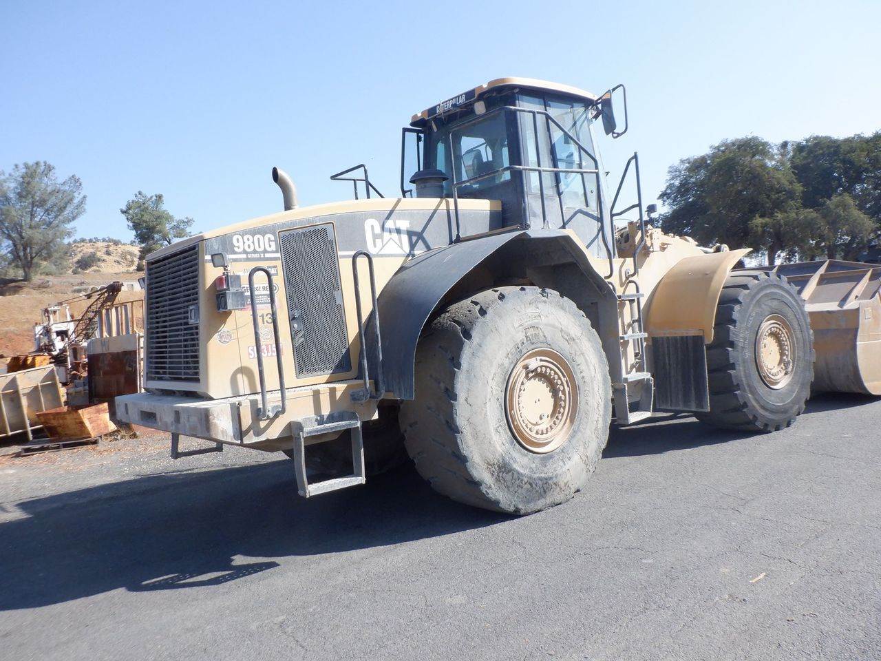 2004 Caterpillar 980G Series II Articulated Wheel Loader w/ 311 HP 3406 Diesel, 2009 DCL DPF, 4 Speed Powershift, Ride Control, 7.25 cy / 134" GP Bucket Enlarged to 8.5 cy w/ Pan Liner & BOCE, Side Pin-On Router Bits, 2021 Loadrite Bucket Scale, Fast Fuel, Counterweights w/ Pin Hitch, Front 29.5R25 L-5 & Rear E-4 Tires (F70/R30%), Command Control Steering, EROPS w/ Heat & A/C, Lights, at Rio Linda Plant, 2016 $144,300 Major Power Train Rebuild by Dealer, $16,900 in 2023 Repairs, 30,274 Hours on Meter, Fair.